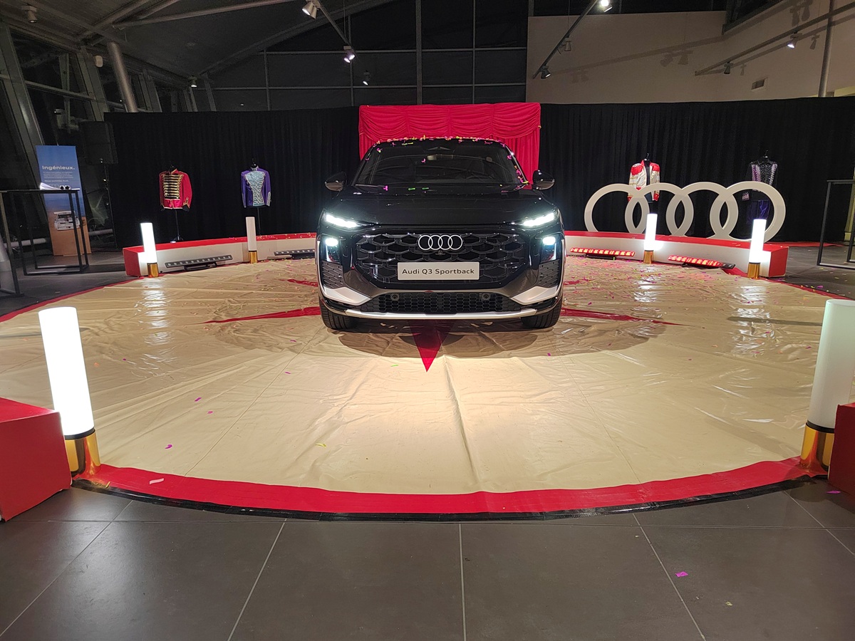Pour l’occasion, l’espace de vente de la concession est entièrement transfiguré : un fond de scène, composé d’un rideau noir et d’une entrée des artistes en velours rouge, donne une dimension spectaculaire à l’événement. Au centre du showroom, la piste de cirque accueille la star de la soirée : Le nouveau Q3 Sportback dissimulé sous un drap de satin. Un souci particulier est apporté aux finitions avec une exposition de costumes, des panneaux et éléments décoratifs. Le tout souligné par des projecteurs et une ambiance musicale renforçant l’immersion dans le thème avec l’appui de notre partenaire Cobra.