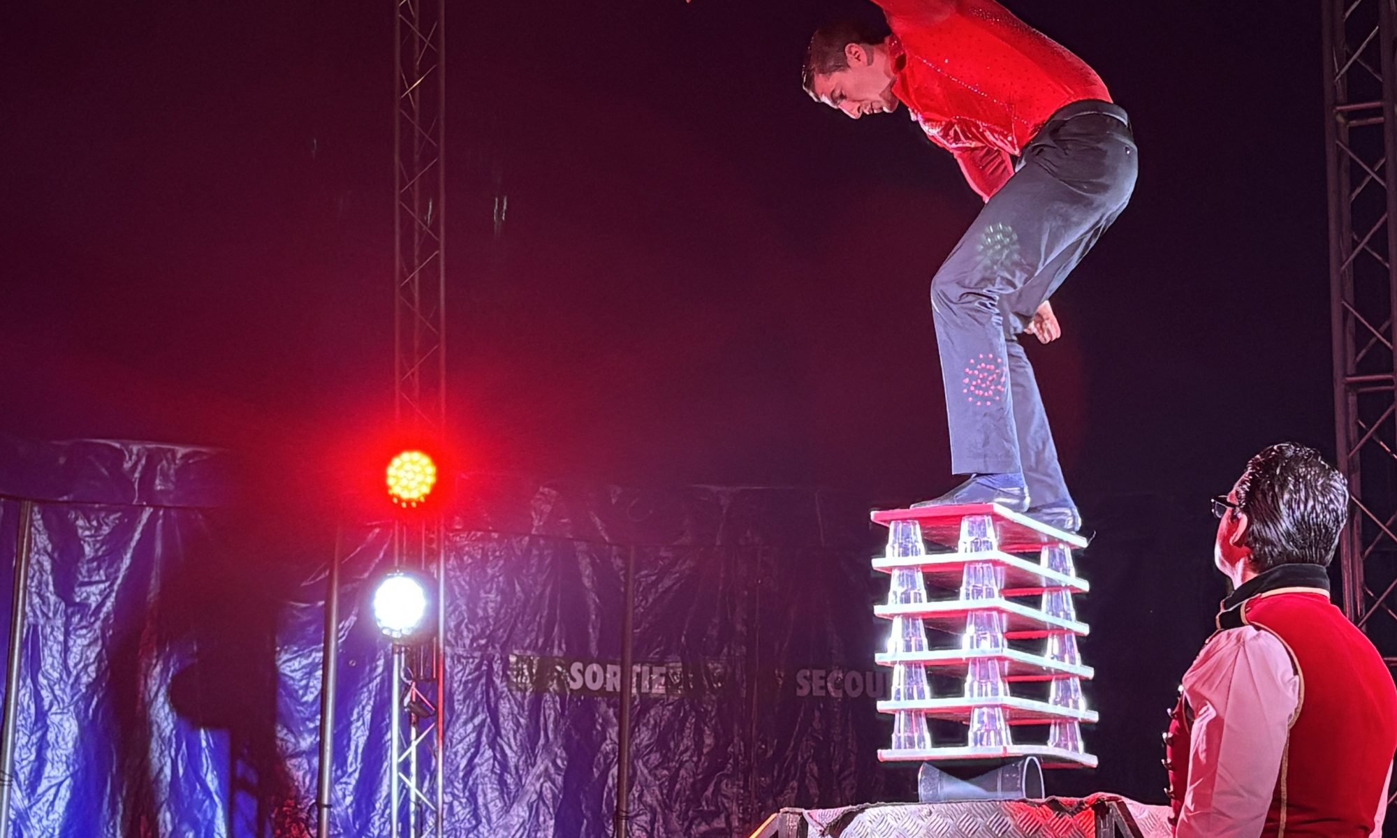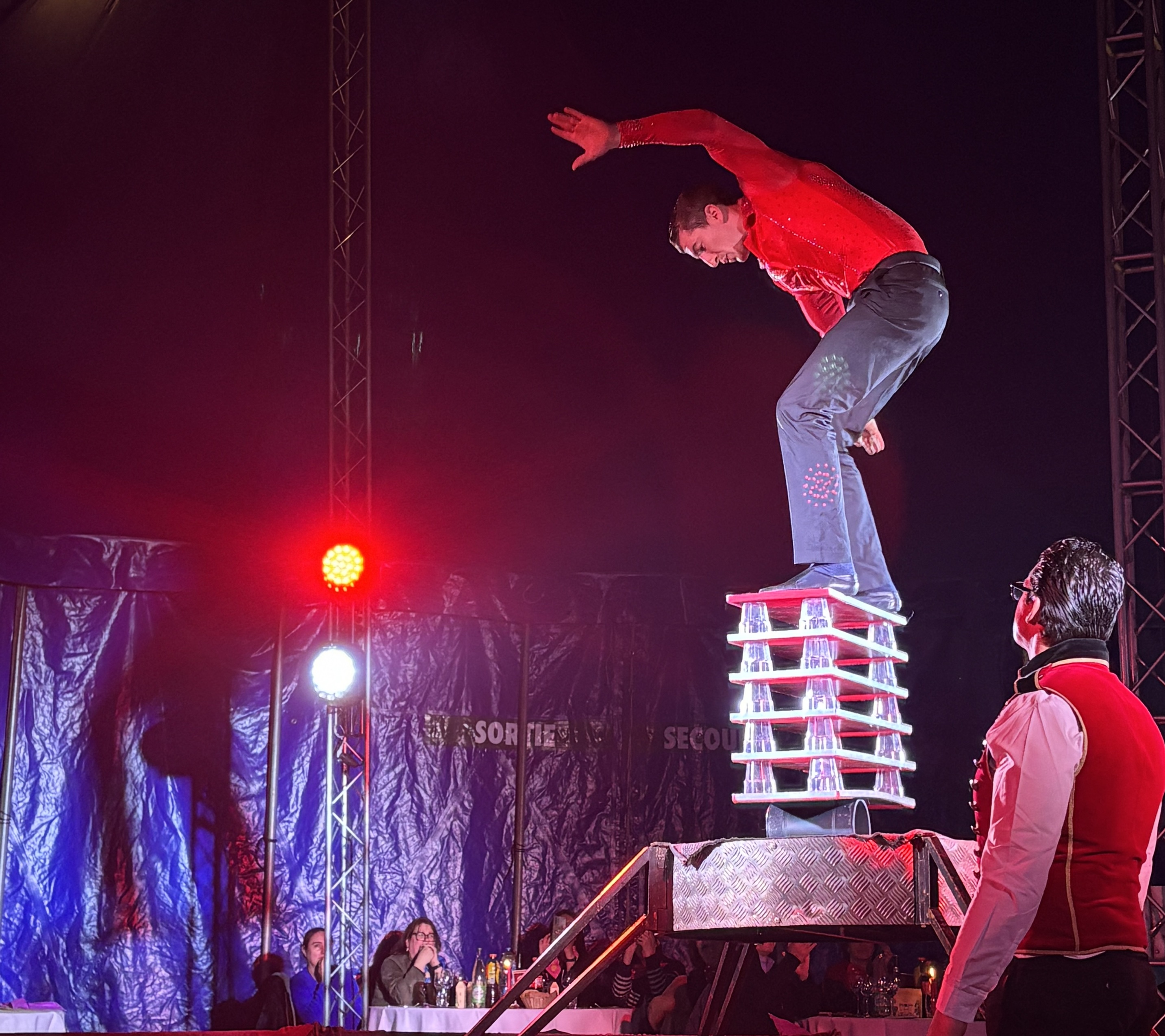 Après le plat, place à la deuxième partie : jonglage, énergie comique façon cascadeurs “Blues Brothers”, performance aérienne à la sangle, puis l’intervention du clown qui déclenche les rires et resserre l’ambiance.